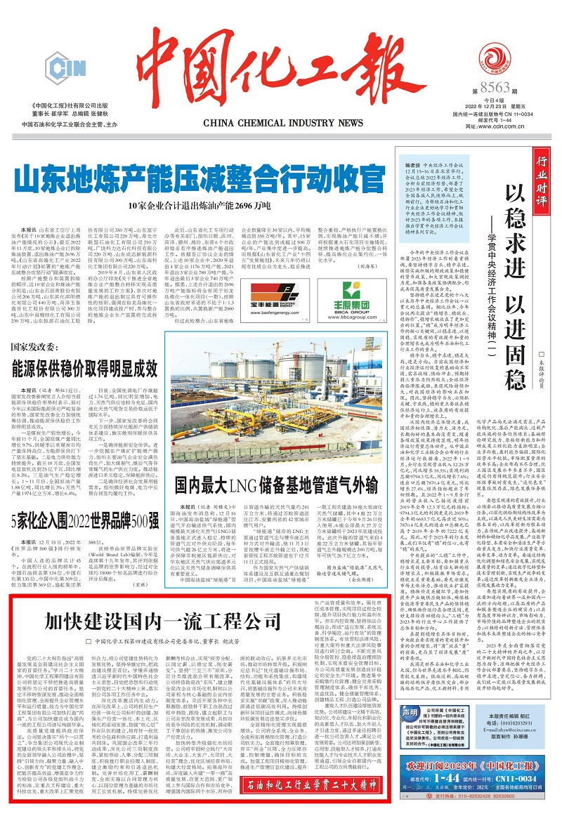 12月23日,《中國(guó)化工報(bào)》頭版全文刊登公司黨委書記、董事長(zhǎng)胡流芳學(xué)習(xí)貫徹黨的二十大精神體會(huì)文章《加快建設(shè)國(guó)內(nèi)一流工程公司》,全文如下。